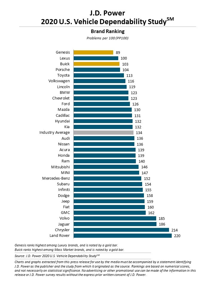 П'ять останніх рядків рейтингу зайняли GMC (162), Volvo (185), Jaguar (186), Chrysler (214) і Land Rover (220).