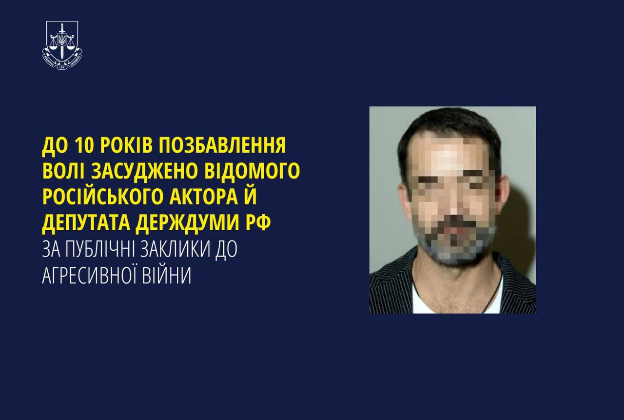 Український суд засудив заочно до десяти років позбавлення волі відомого російського актора та депутата Держдуми РФ. Його визнали винним у публічних закликах до агресивної війни, посяганні на територіальну цілісність і недоторканність України.