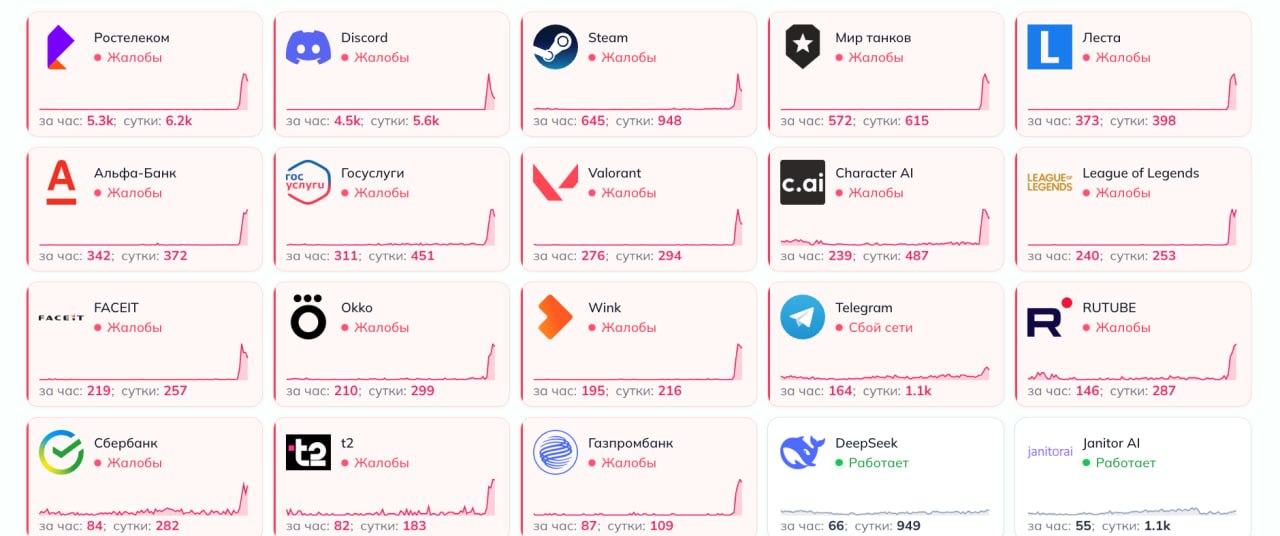Згідно з цією інформацією, користувачі з РФ поскаржилися на масштабні збої в роботі сервісів: "Альфа Банку", Ощадбанку, Газпромбанку, "Ростелекому", онлайн-кінотеатрів Wink та Okko, "Держпослуг", Steam та "Діскорда", а також ряду інших послуг. Рекордсменом став Discord — майже п'ять тисяч скарг за останню годину.