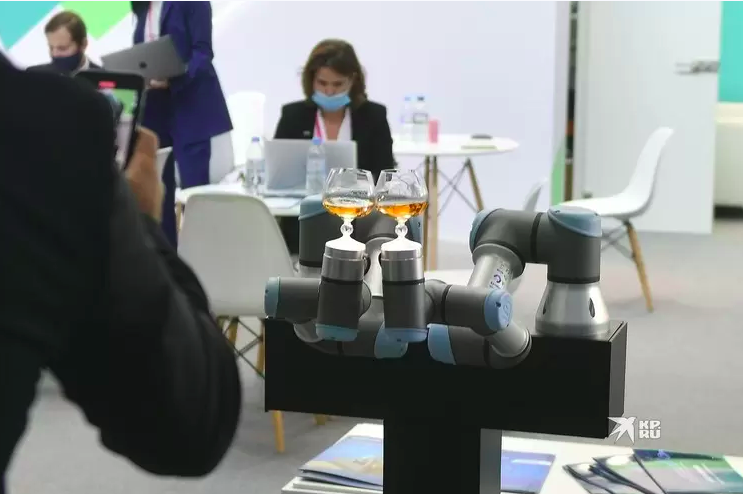 У Росії на виставці "Іннопром-2021" вчені з Липецька показали пару незвичайних роботів, які вміють тримати келих з випивкою і чокатися.