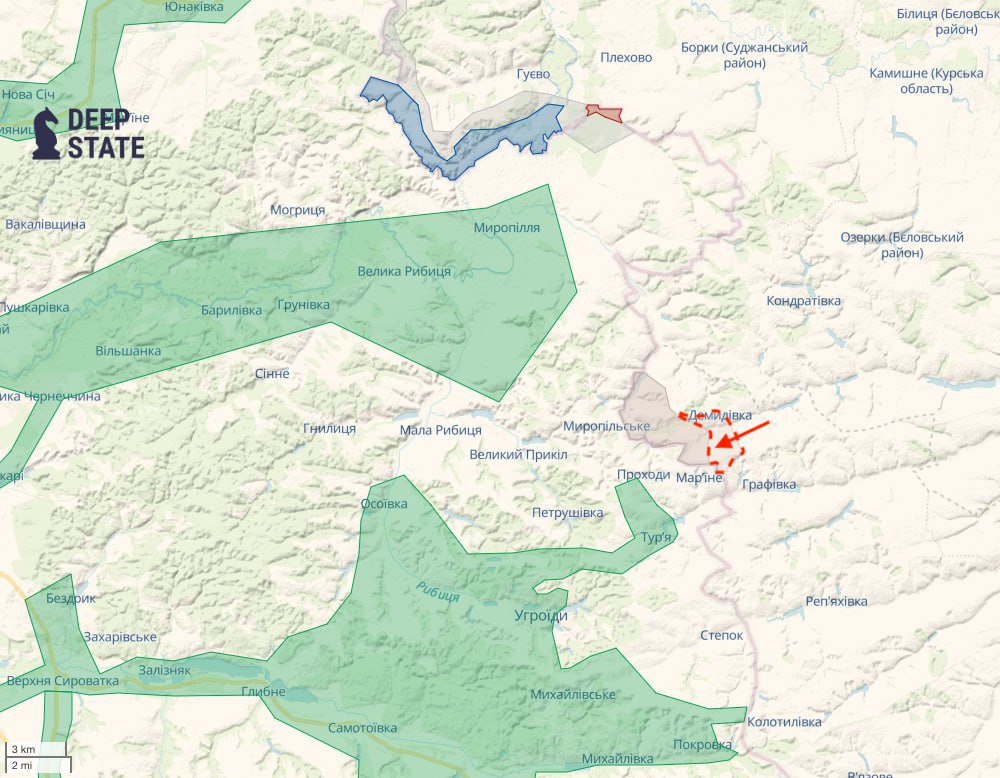 Раніше аналітики проєкту DeepState повідомили, що російські війська просунулись біля Демидівки - села у Красноярузькому районі Бєлгородської області РФ.