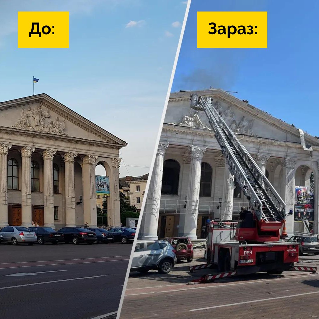 Зазначається, що внаслідок влучання ворожої ракети знищено вщент пам'ятку архітектури місцевого значення Чернігівський обласний академічний музично-драматичний театр імені Т. Шевченка.