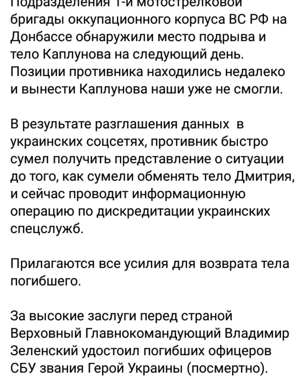 1 грудня бойовики та російські найманці з так званої 1-ї мотострілкової бригади корпусу Збройних Сил РФ знайшли тіло Каплунова. Використавши розголос у соцмережах, противник зрозумів, яку вигоду може отримати із ситуації, що склалася, та відмовився віддавати тіло загиблого.