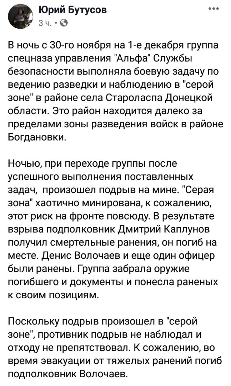 Раніше "Апостроф" повідомляв, що у мережі з'явилося відео із загиблими 1 грудня на Донбасі офіцерами спецпідрозділу СБУ "Альфа" - 37-річним Денисом Волочаєм та 38-річним Дмитром Каплуновим.