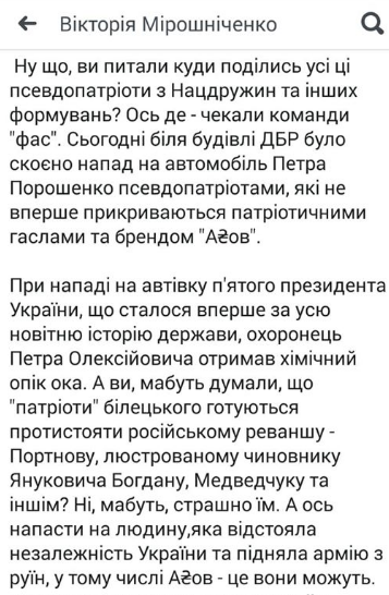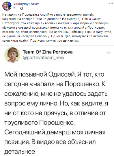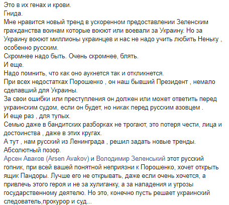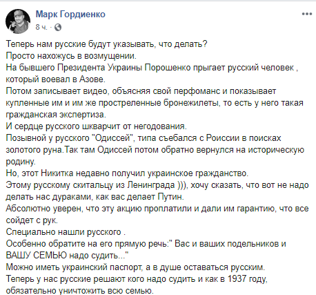 "Тепер нам російські вказуватимуть, що робити? Просто перебуваю в обуренні. На колишнього Президента України Порошенко стрибає російська людина, яка воювала в Азові", - написав громадський активіст Марк Гордієнко в Facebook.