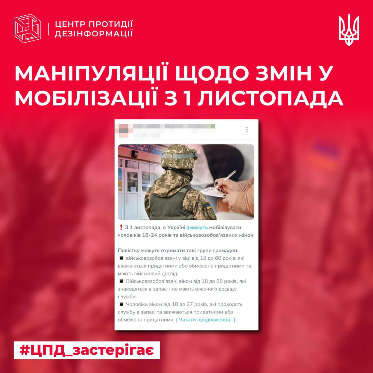 У новині вказується, що з 1 листопада в Україні зможуть мобілізувати чоловіків 18-24 років та військовозобов"язаних жінок.