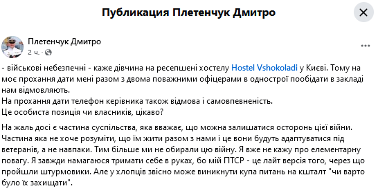 Він зазначив, що хотів разом з двома офіцерами пообідати в закладі "Hostel Vshokoladi", однак їх не пустили на поріг. Як причину вказали те, що "військові небезпечні".