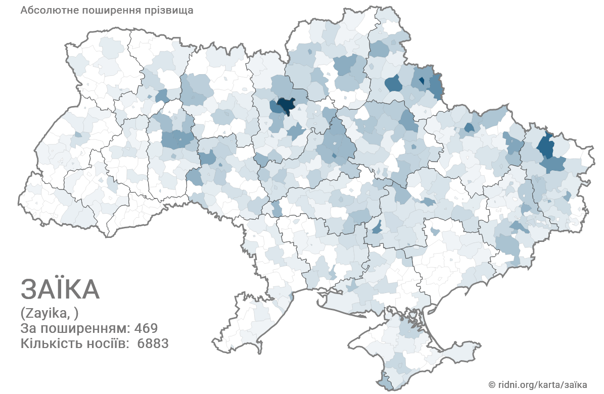 Прізвище Заїка зараз налічує 6883 носіїв. За поширенням займає 469 місце. Найчастіше зустрічається на Запорожжі. Схожі прізвища - Заїченко, Заїкіна, Заїць, Заїкін, Заїчко.