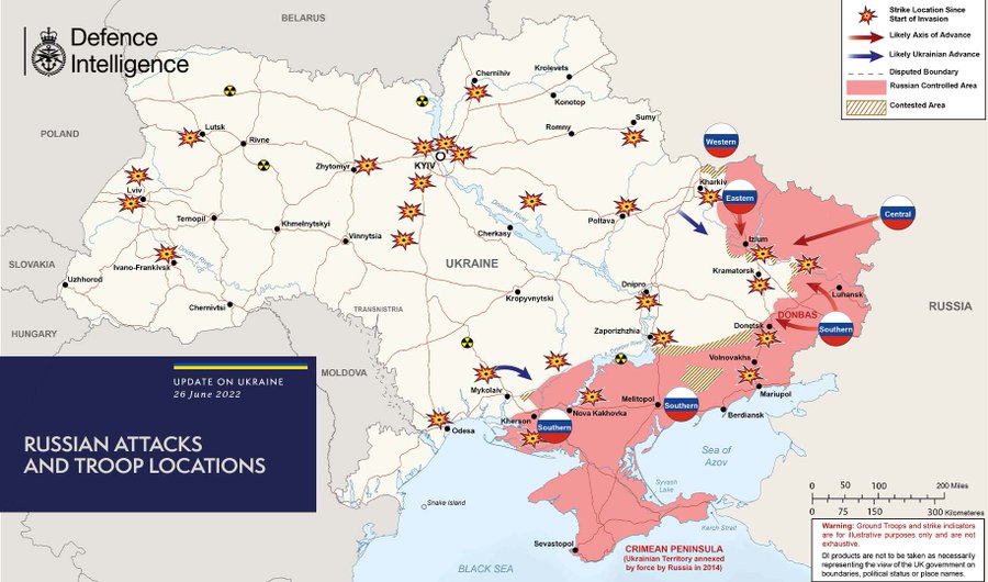За даними британської розвідки, російські окупанти зайняли Сєвєродонецьк у Луганській області, тоді як Збройні сили України підійшли до зайнятого російської армії Херсона.