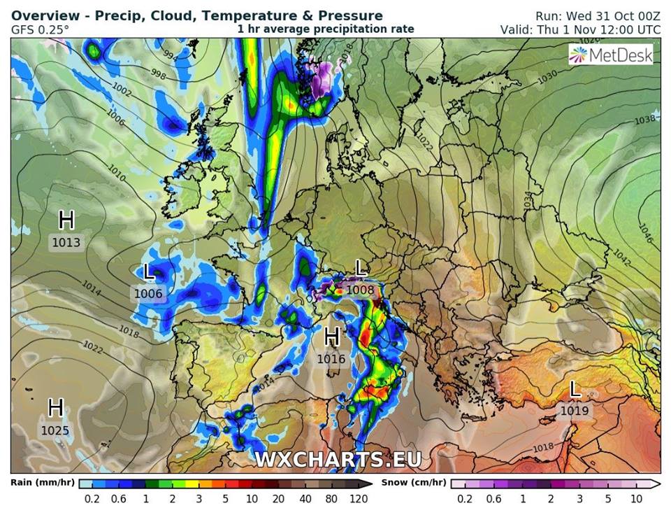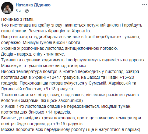 "Починаю з Італії. 1-го листопада на країну знову накинеться потужний циклон і пройдуть сильні зливи. Зачепить Францію та Хорватію. Якщо ви завтра туди збираєтесь чи вже в Італії перебуваєте - уважно, обережно. Мінімум гумові високі чоботи. Україна ж розпочинає листопад антициклонічною погодою. Дощів - навряд, снігу - тим паче. Тумани та серпанки ходитимуть і погіршуватимуть видимість на дорогах. Максимум, з туманів може випадати мряка", - пише синоптик.