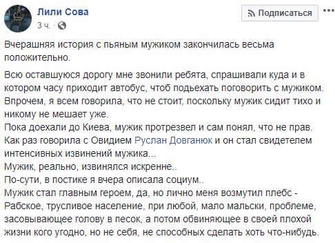 "У маршрутці п'яний мужик, який сів в якомусь селі по шляху, (здається Лазірки або щось поруч) бешкетує. Ну, типу, п'яний, що з нього візьмеш? Населення, як щури - або мовчать поступово очі або розбігаються подалі. Ну хто ж ризикне вякнуть п'яному мужику? Якщо не я, то хто ж?))) Поліз до мене в бійку.. Ну я ж дівчинка. Ударив він (бл*дь, не терплю, коли на мене руку піднімають!), довелося дати йому в морду. І пофіг, що в два рази більше і више.. Народец взагалі в розсипну шмигнув. Подалі", - написала волонтер.