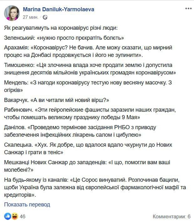 Ймовірну реакцію політиків на це повідомлення опублікувала на своїй Facebook-сторінці журналіст Марина Данилюк-Єрмолаєва.