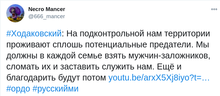 "У свідомості обивателя немає відповідальності за цю територію ... Непричетність народжує байдужість, а байдужість породжує зраду. Якщо кожна сім'я буде знати, що, хочуть вони чи ні, але чоловік з цієї сім'ї піде служити батьківщині, то відбудеться переосмислення всього, що пов'язано з існуванням цієї родини... Спочатку буде ломка, потім з цією думкою звикнуть, потім почнуть визнавати цю думку цілком об'єктивною і адекватною", - пояснив Ходаковський.