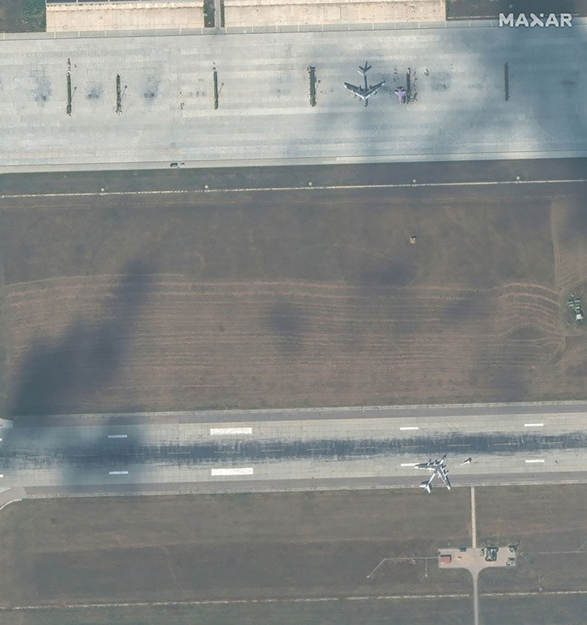 ТБ-канал опублікував супутникові знімки Maxar з російської авіабази "Енгельс", на яких видно два стратегічні бомбардувальники Ту-95 з автомобільними шинами на них.