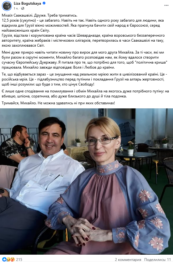 "Навіть одного року забагато для людини, яка відкрила для Грузії вікно можливостей. Яка прагнула бачити свій народ в Євросоюзі, серед найзаможніших країн Світу. Грузія, відстала і корумпована країна часів Шевардназде, країна воровського беззаперечного авторитету, країна жебраків і містечкових олігархів, перетворилась в часи Саакашвілі на таку, якою захоплювався Світ...", - зауважила Богуцька.
