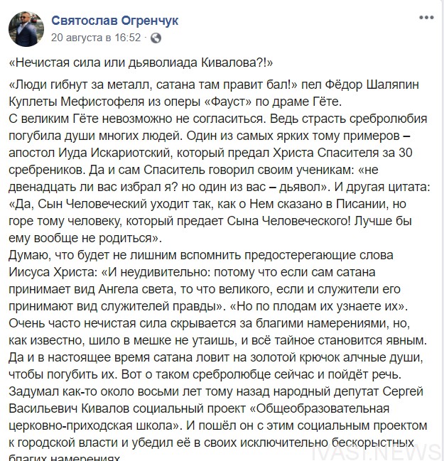 "Задумав якось близько восьми років тому народний депутат Сергій Васильович Ківалов соціальний проект "Загальноосвітня церковно-парафіяльна школа". І пішов він з проектом до міської влади і переконав її в безкорисливих благих намірах. І повірила Ківалову міська влада, і виділила йому в 2013 році землю: не просту, а цілих 1,3 гектара землі на міжрейсовій базі моряків, на суперпільгових умовах. Закипіла робота. І все було б добре, але виявилося, що землю міська влада передала на суперпільгових умовах, та ще на 49 років Благодійному фонду "Студентська церква", яким де-факто керує Ківалов. Ось у чому підступ: Сергій Васильович на доброту і довіру до нього міської влади вирішив відповісти підлістю, лукавством і зрадою. А підлість у тому, що Благодійний фонд "Студентська церква", не бентежачись, передав землю у МГУ, яким володіє "меценат" Сергій Ківалов. І що ж мають одесити, які чекали від цього соціального проекту загальноосвітню церковно-приходську школу, в якій навчання дітей повинно здійснюватися безкоштовно, бо в православному світі всі церковно-приходські школи завжди були безкоштовними. Одесити отримали приватну дорогу Міжнародну академічну школу Одеси. Вартість навчання в цій школі становить 11 тисяч 700 гривень на місяць", - написав він.