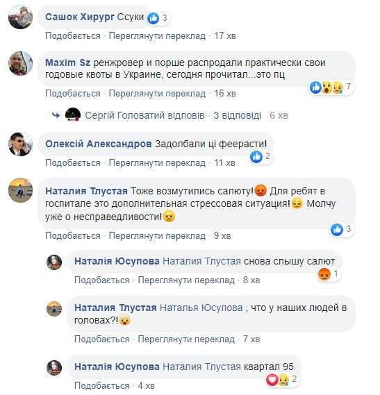 "Ось тільки волонтер прислала відео як біля Мар'їнки грюкають знаряддя, йде бій і тут чую в центрі Києва запустили салют. Що святкуєте?? У центрі міста лежать поранені хлопці в госпіталі, Ви сволочі навіть не хочете розуміти, що в країні війна і що відчувають воїни без рук і ніг, як реагують контужені на Ваші салюти!! Два різні світи в одній країні. Як назвати тих, хто на сьомому році війни не навчилися поважати людей, які віддають свої життя на фронті??! Совість втратили зовсім ", - обурилася автор публікації.