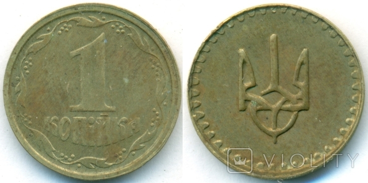 Вказано, що монету було випущено Національним банком України у 1992 році. Вона виготовлена з латуні, вага 1,68 грама, в побуті не була. Її особливістю є нетиповий герб на аверсі, що нагадує тризуб Київської Русі часів князя Володимира Великого, гладкий гурт та широкий шрифт без вказівки року карбування монети. Різновид монети вказаний, як 1БА(1 коп) г-3. Лот знаходиться на Київщині, але існує можливість відправлення в будь-який куточок України.