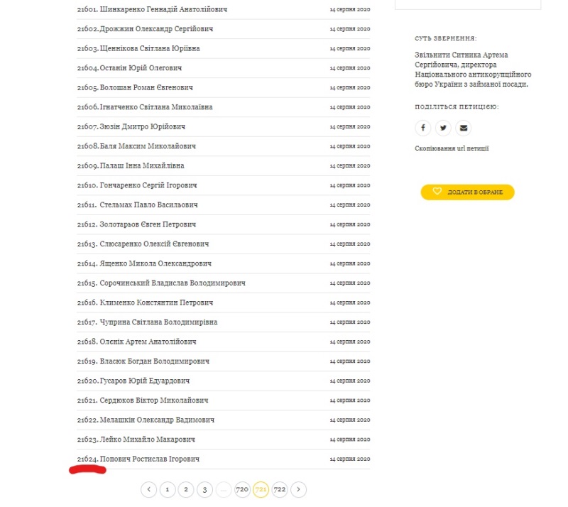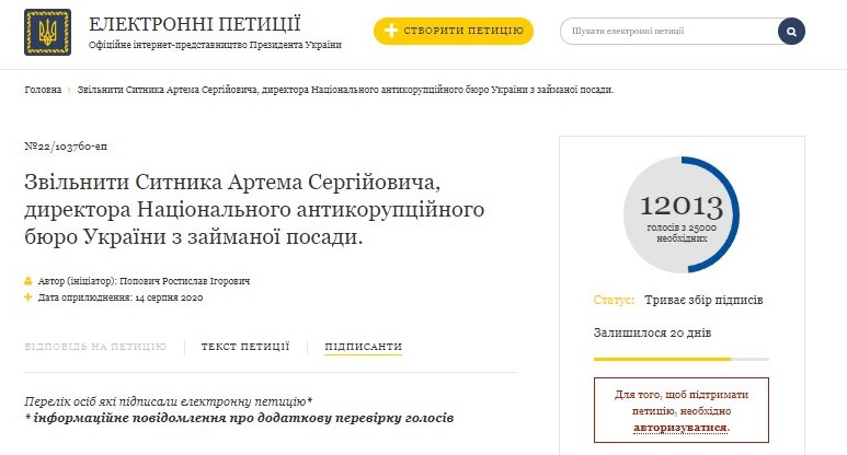 Так, петиція на сайті президента №22 / 103760-еп "Звільнити Ситника Артема Сергійовича, директора Національного антикорупційного бюро України з займаної посади" не отримує всі голоси тих, хто проголосував на сайті.. На це ЗМІ звернули увагу в серпні, а Офіс президента пояснював це "необхідністю додаткової перевірки голосів". Однак ситуація не змінилася - голоси половини осіб з тих, хто проголосував за відставку Ситника, не зараховуються. На сьогодні зареєстровано 21 624 підписали петицію. Однак зараховано лише 12 013 голосів, тобто близько половини.