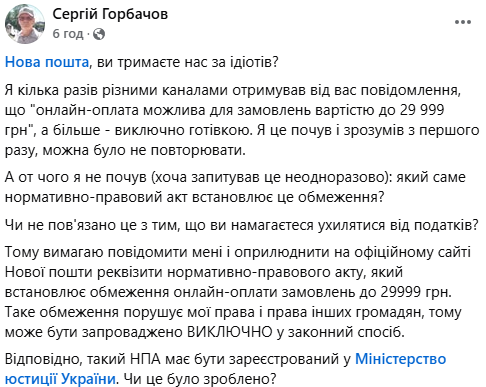 Колишній освітній омбудсмен України Сергій Горбачов обурився обмеженням онлайн-оплати у "Новій пошті" сумою до 29999 гривень. Він підозрює, що такі обмеження можуть бути пов'язані з ухилянням від оплати податків.