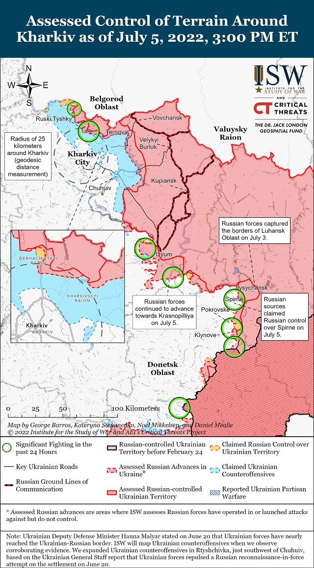 Такий висновок зроблено на підставі заяви секретаря Ради безпеки Росії Миколи Патрушева 5 липня. Він сказав, що російська військова операція в Україні триватиме доти, доки РФ не досягне своїх цілей щодо захисту цивільного населення від "геноциду", денацифікації та демілітаризації України, а також зобов'яже Україну зберігати постійний нейтралітет між Росією та НАТО. Патрушев практично повторив цілі, озвучені президентом Росії Володимиром Путіним у своїй промові 24 лютого.
