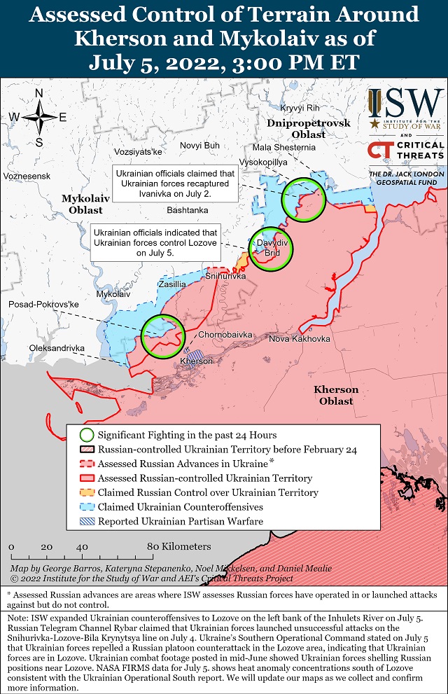 На південній ділянці фронту росіяни зайняті утриманням оборонних рубежів та відображенням українських контрнаступів. Українські війська відбили атаку ворога біля Лозового (на південний захід від Давидового мосту в Херсонській області). Українці або відновили плацдарм у Лозовому, або постійно підтримували плацдарм, створений на початку червня.