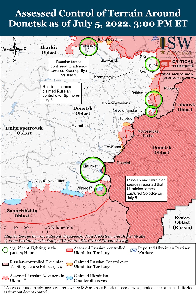 Крім того, росіяни намагалися просуватися на захід від Лисичанська у бік Сіверська і продовжили наступальні дії на південний схід від Бахмута.