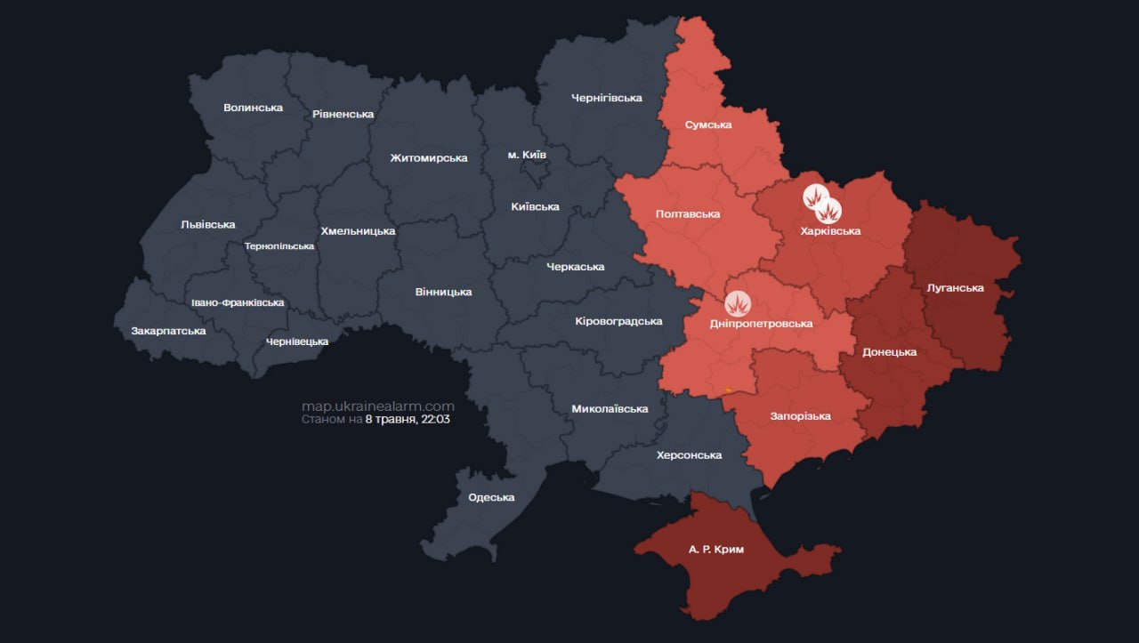 Увечері 8 травня у Харкові та Дніпрі пролунала серія вибухів під час повітряної тривоги, в регіоні було оголошено повітряну тривогу.