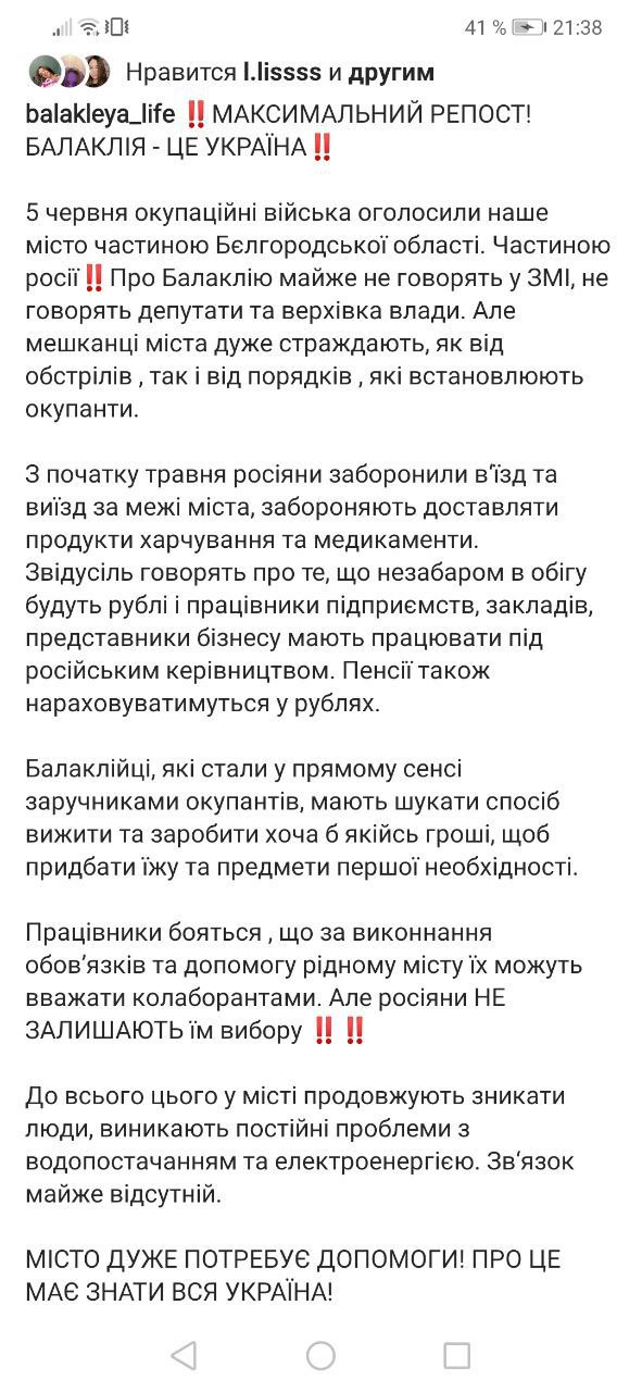 Про це йдеться у публікації Вalakleya_life в Іnstagram.