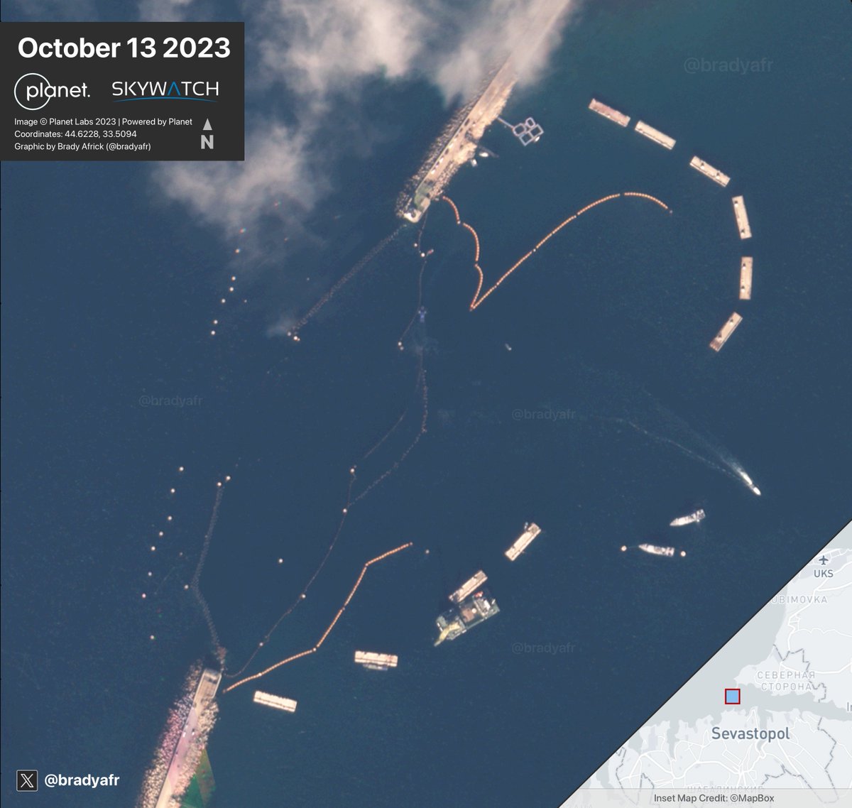"Ось нещодавній погляд на бар'єри, які Росія встановила на вході до Севастопольської гавані у Криму, щоб протистояти українським військово-морським безпілотникам", – йдеться у повідомленні аналітика.