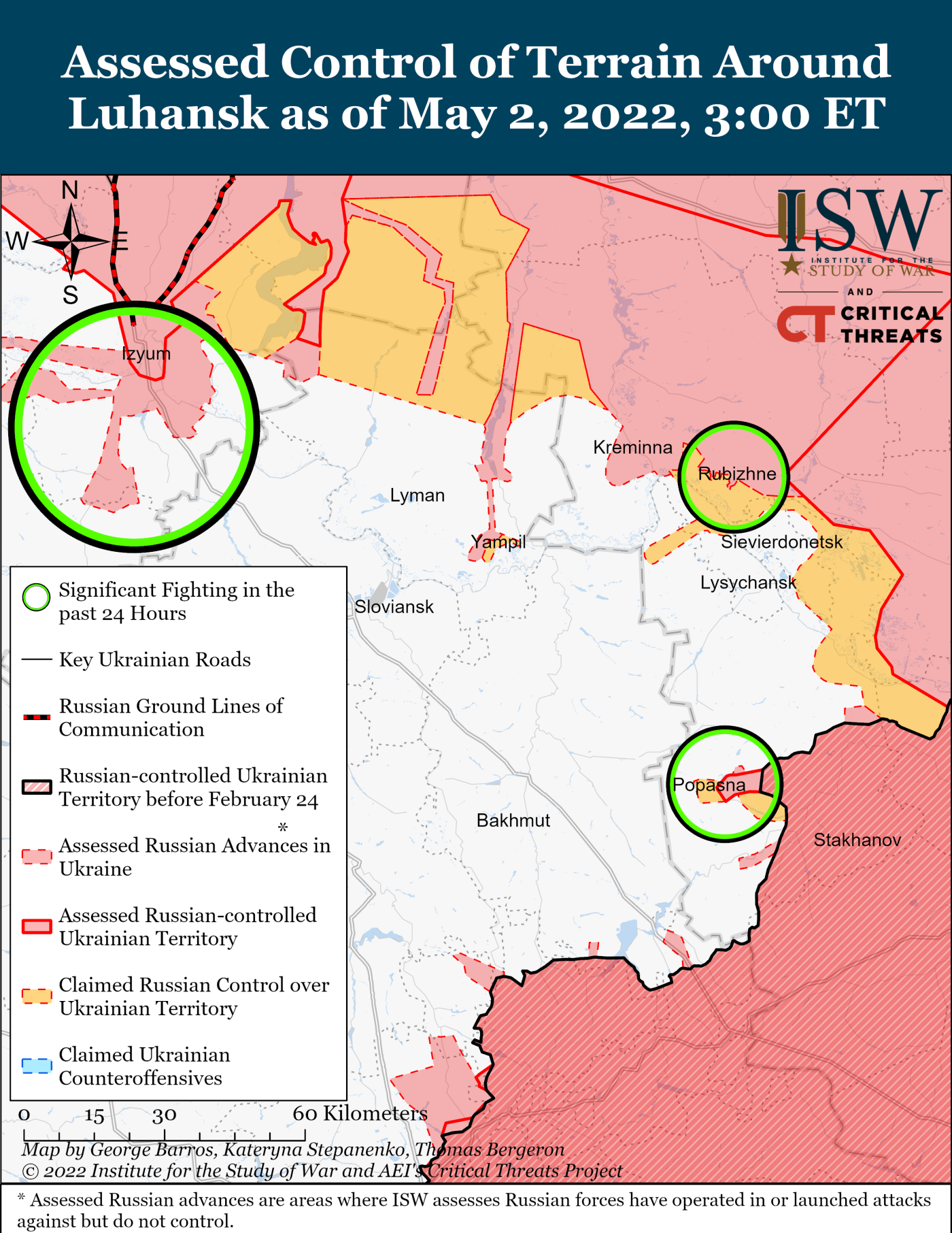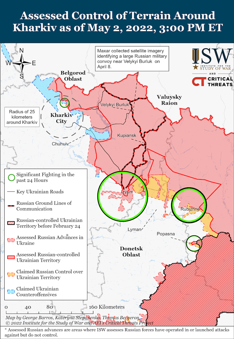Окупаційне військо намагається захопити Рубіжне та Попасну. За даними Генштабу ЗСУ туди направляється ще одна БТГ ворога для покращення становища та спроб наступу на Сєвєродонецьк. Водночас з лінії Лиман-Сіверськ росіяни хочуть створити умови для наступу на Слов'янськ.