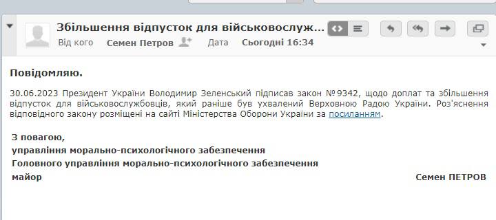 "Ворог проводить фішингову атаку на встановлені адреси електронної пошти. Отримавши такий лист не відкривайте та не клікайте на файли, додані до листа, та на посилання в самому листі", – йдеться у повідомленні СтратКому, який оприлюднив скрін подібного листа за темою "збільшення відпусток для військовослужбовців" від "майора Семена Петрова".