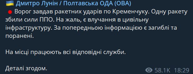 У п'ятницю, 22 вересня, Росія здійснила черговий терористичний акт, завдавши ракетного удару по Кременчуку Полтавської області.