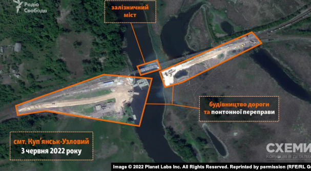 Будівництво понтонно-залізничної переправи через річку Оскіл на південь від Куп"янська-Вузлового зафіксував супутник Planet Labs 3 червня. На ньому видно, що спорудження переправи - з обох берегів річки. Також прокладається дорога. Помічена будівельна техніка та військова техніка РФ біля дерев.