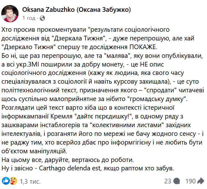 "Хто просив прокоментувати "результати соціологічного дослідження від "Дзеркала Тижня", - дуже перепрошую, але хай "Дзеркало Тижня" спершу те дослідження покаже. Бо ні, ще раз перепрошую, але та "малява", яку вони опублікували, а всі укр.ЗМІ поширили за добру монету, - це не опис соціологічного дослідження (кажу як людина, яка свого часу спеціалізувалася з соціології й навіть курсову захищала), - це суто політтехнологічний текст, призначення якого – "спродати" читачеві щось суспільно малоприйнятне за нібито "громадську думку", - йдеться у повідомленні.