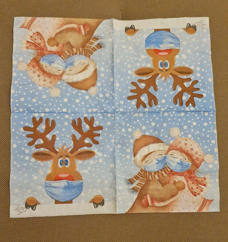 Серветки виконані в пастельних тонах, крім оленя в масці, на них також зображені діти в зимовому одязі і масках на обличчях.