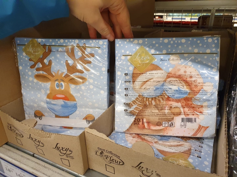 Наближається Новий рік, який в цьому році буде незвичайним - святкування пройде в умовах карантину. В Україні почали виробляти тематичні новорічні серветки. На них зображений олень в масці.