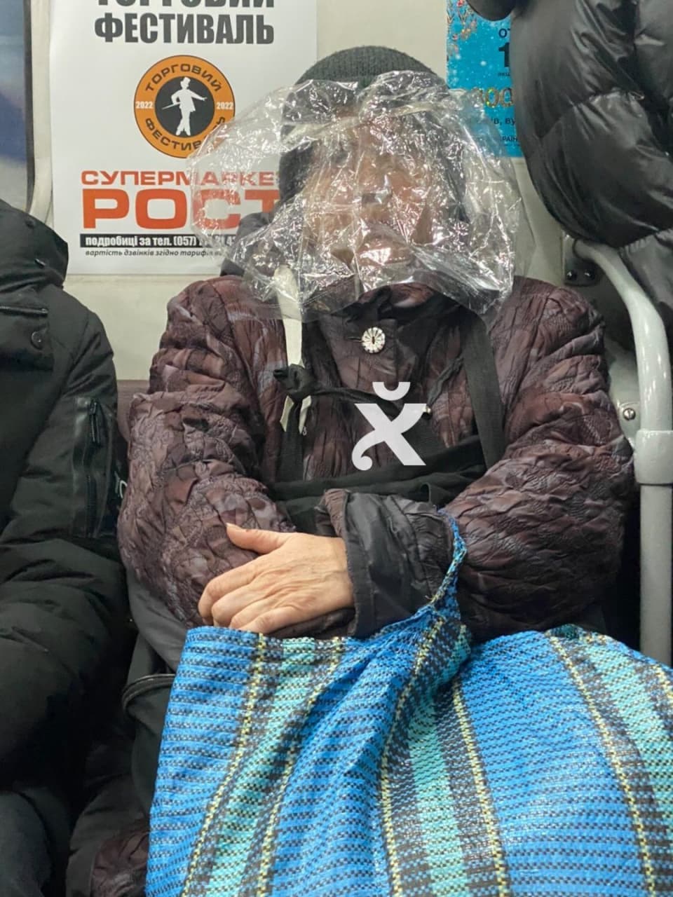 Соцмережі потішило фото літньої жінки у вагоні харківського метрополітену в нестандартній захисній "масці" від коронавірусу. Вона прикріпила до трикотажної шапки листок щільної прозорої плівки, який повністю закрив її обличчя.