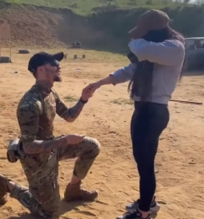 Так, боєць бригади "Червона Калина" вирішив запропонувати своїй коханій руку та серце по-військовому.