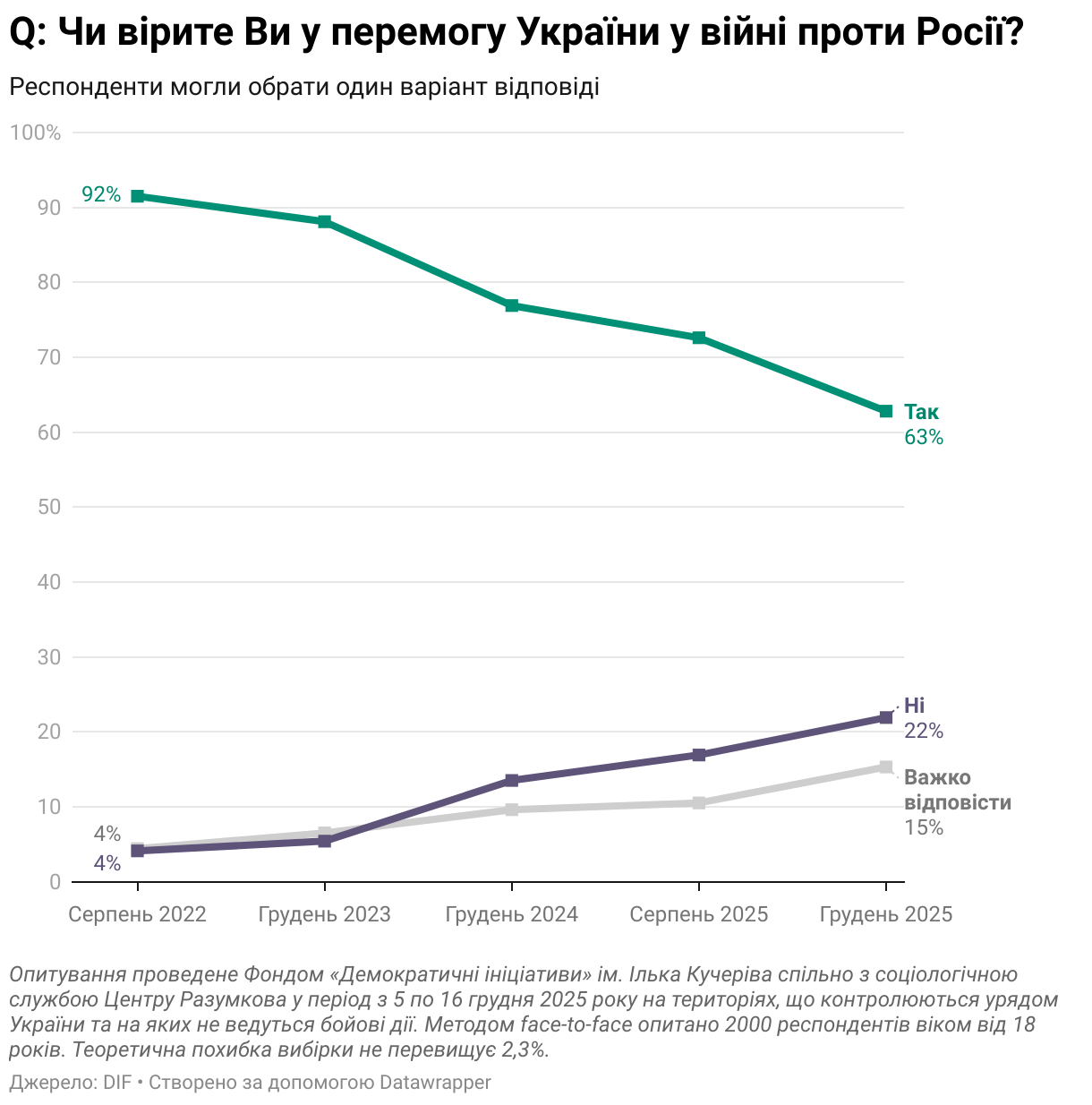 У серпні 2025 року віра у перемогу знизилася з 73% до 63%, а порівняно з даними за грудень 2024 року падіння відбулося з 77%.