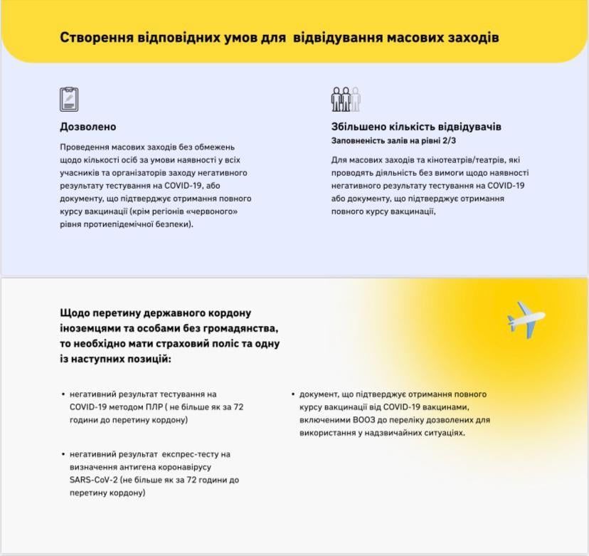 Кабмін дозволив проводити масові заходи за участю більше однієї людини на 4 кв м, якщо захід проводиться на відкритому повітрі. Якщо всі учасники та відвідувачі матимуть негативні ПЛР-тести або тести на антиген, або сертифікати про вакцинації, ніякі обмеження не застосовуються.