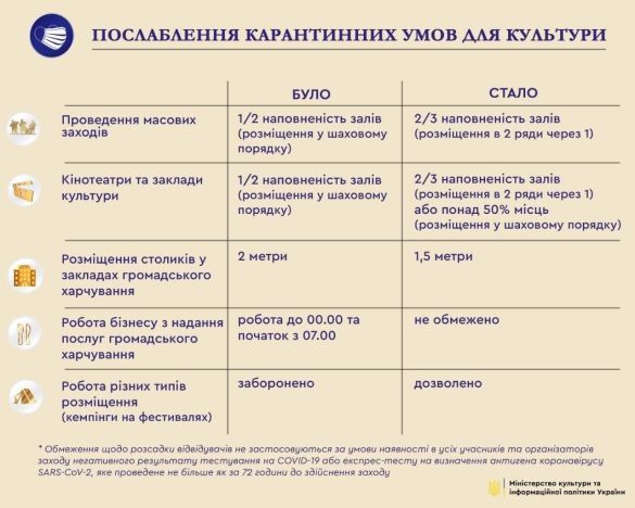 Також можна проводити спортивні заходи із заповненою 2/3 місць. Також постановою змінено порядок розсадження людей в кінотеатрах та концертних залах. Один порожній ряд повинен слідувати за двома заповненими.