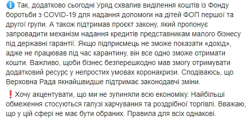 "Так, додатково сьогодні уряд схвалив виділення коштів з Фонду боротьби з COVID-19 для надання допомоги на дітей ФОП першої і другої групи. А також підтримав проект закону, який пропонує ввести механізм надання кредитів представникам малого бізнесу під державні гарантії", - пише Шмигаль.