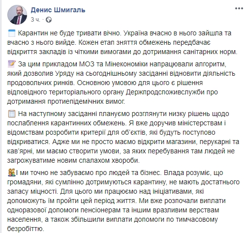 Шмигаль додав, що влада розуміє, що громадяни, які сумлінно дотримуються карантину, не мають "достатнього запасу міцності" і тому розробляє ряд заходів, що допоможуть українцям пережити карантин.