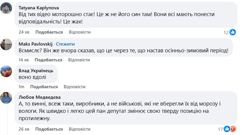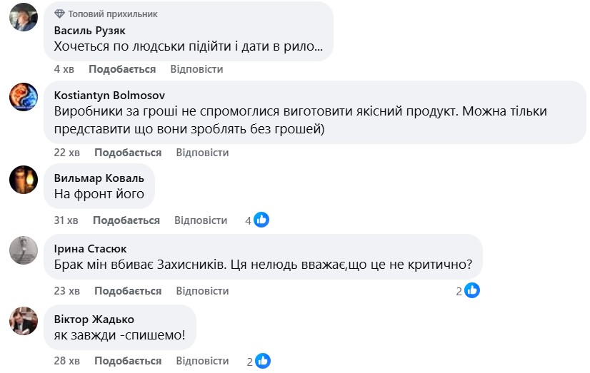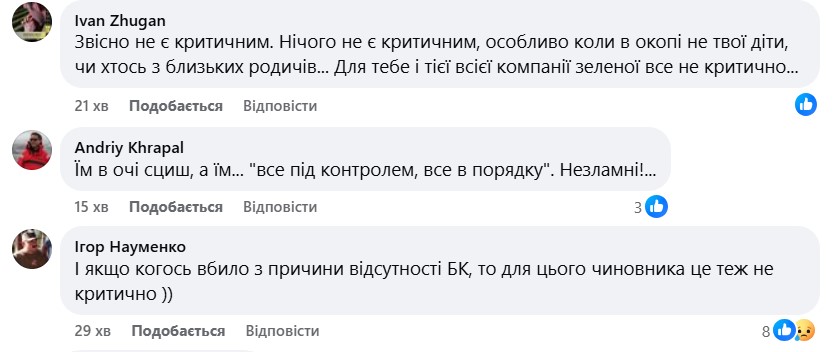 "Звісно не є критичним. Нічого не є критичним, особливо коли в окопі не твої діти, чи хтось з близьких родичів", - написав один з коментаторів.
