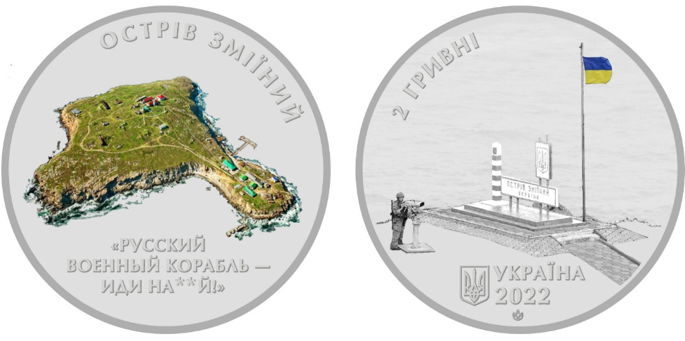 На аверсі буде зображений острів Зміїний, на якому в перший день війни сталося зіткнення українських прикордонників і воїнів ЗСУ з російським воєнним кораблем, та написи: ОСТРІВ ЗМІЇНИЙ (угорі), "РУССКИЙ ВОЕННЫЙ КОРАБЛЬ – ИДИ НАХ**Й!" (унизу)