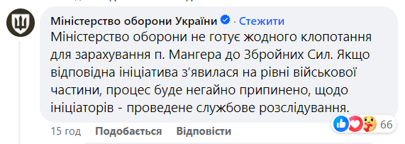 Під самим дописом у Facebook Міністерство оборони України залишило коментар із зазначенням, що не готує жодного клопотання для зарахування Мангера до ЗСУ: