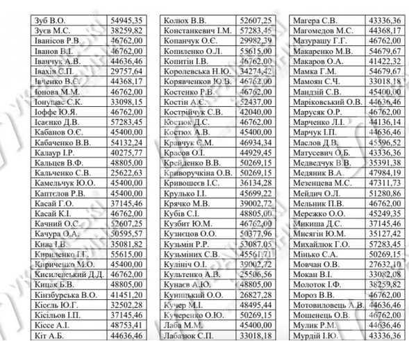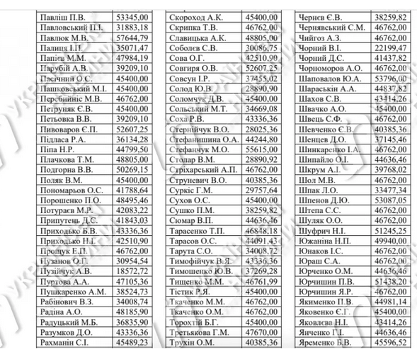 Співголовам групи "За майбутнє" Віктору Бондарю та Тарасу Батенку нарахували 37,7 тисячі грн та 48,8 тисячі грн відповідно, голові Олегу Кулінічу – 39 тисяч грн. Ексспікер Ради Дмитро Разумков отримав 43,3 тисячі грн. Глава партії "Слуга народу" Олена Шуляк - 46,7 тисячі грн.