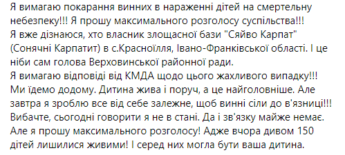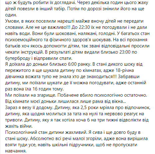 Також, за її словами, усі речі дітей згоріли у вогні й вони вибігли на вулицю в чому були - шортах, майках та капцях. При цьому неповнолітніх тримали на холоді декілька годин, не дали можливість ані зігрітися, ані попити води. Лише через деяких час дітей повезли в інший табір, по дорозі змінивши його на ще один.