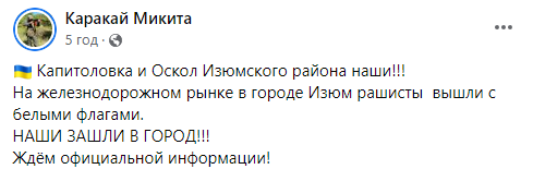 "На залізничному ринку в місті Ізюм рашисти вийшли з білими прапорами. Крім того, ЗСУ звільнили Капітолівку та Оскол Ізюмського району", - повідомив він.